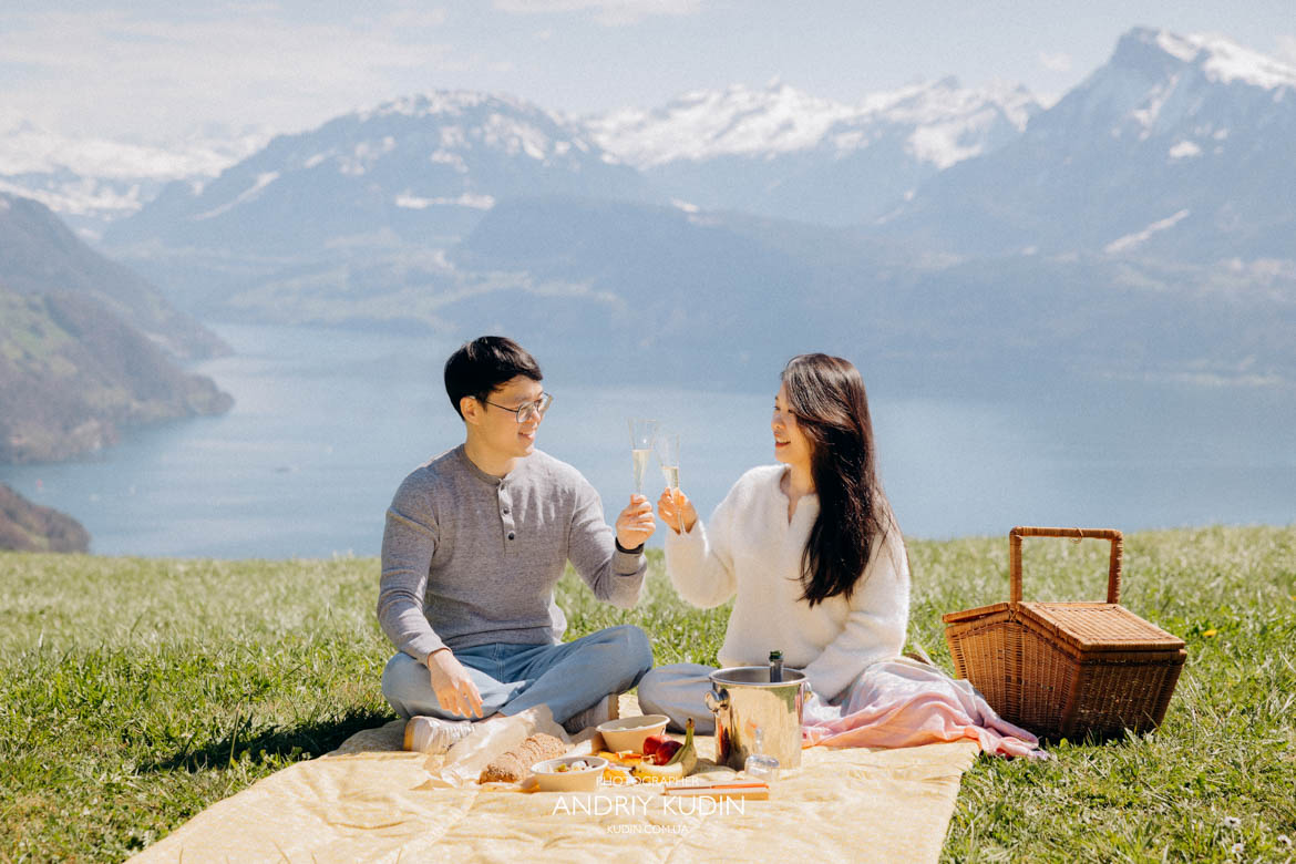 Couple enjoying apero setup at Villa Honegg with Lake Lucerne view Switzerland Romantic picnic with champagne at Villa Honegg overlooking Swiss Alps